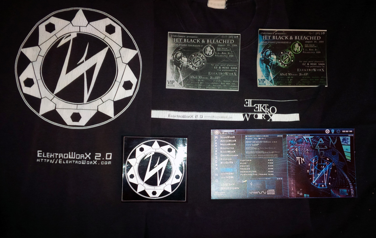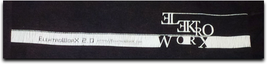 The Text based logo was inspired by the Typesetting of Dave McKean and was featured on the front of the ElektroWorX shirts. The back featured a large redition of the sigil logo.
